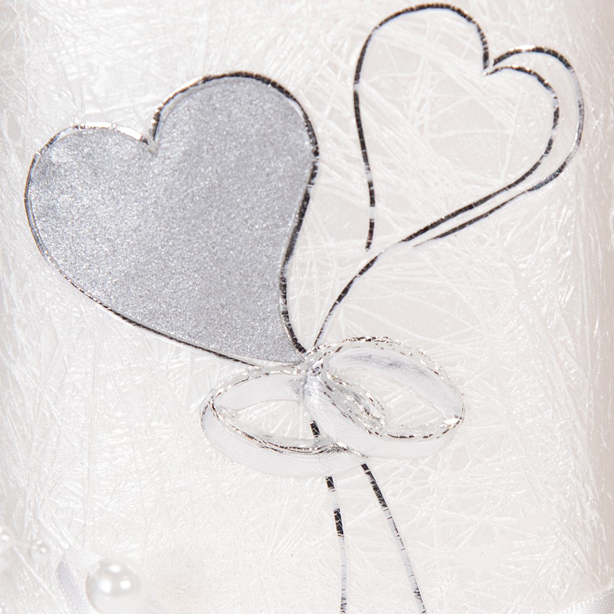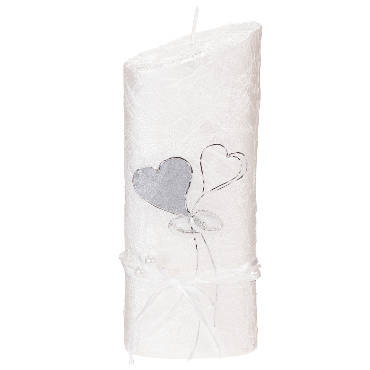 Táto elegantne trblietavá biela svadobná sviečka dokonale doplní výzdobu vášho stola! Vďaka striebornému dizajnu s krúžkami a srdiečkami je táto sviečka ideálna aj na strieborné výročie svadby.