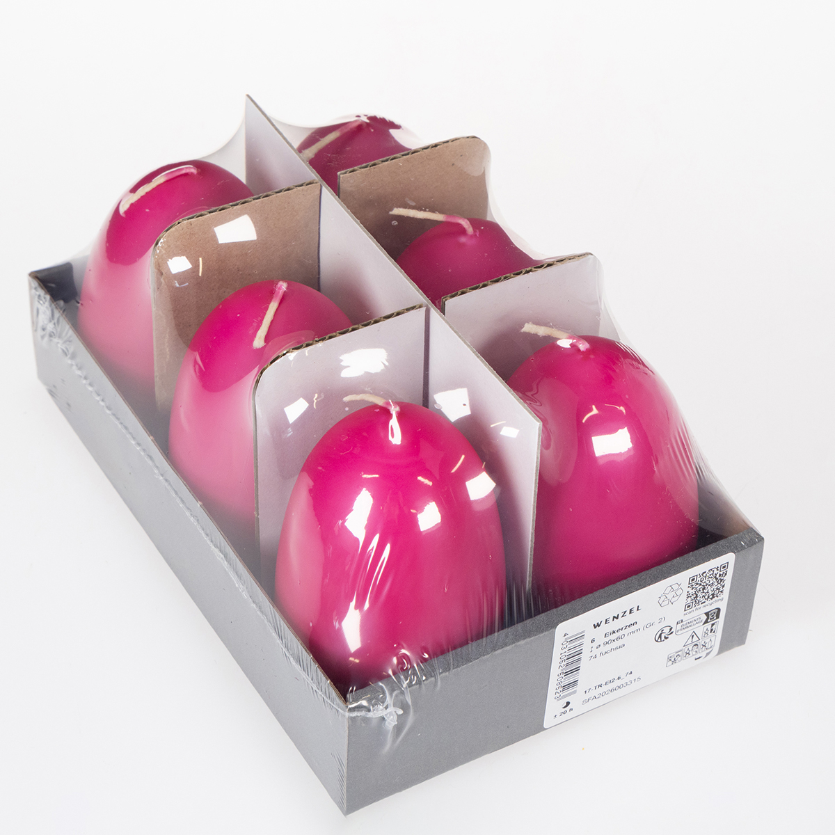 Táto ružová sviečka v tvare vajíčka kombinuje svieže farebné akcenty s vysoko kvalitným remeselným spracovaním. S výškou 9 centimetrov a priemerom 6 centimetrov je perfektným stredobodom jarného prestierania. Jej teplá žiara vytvára prirodzenú a útulnú atmosféru bez toho, aby bola príliš výrazná. Napriek svojej žiarivej farbe nie je sviečka úplne zafarbená. Jemný lesk povrchu jej dodáva modernú eleganciu, ktorá dopĺňa takmer každý štýl interiéru. Či už uprednostňujete minimalistický škandinávsky vzhľad alebo niečo hravejšie, táto ružová sviečka v tvare vajíčka dodá farebný nádych bez toho, aby obetovala nadčasovosť. Pre obzvlášť harmonický vzhľad skombinujte sviečku s pastelovými obrúskami, čerstvými kvetmi, ako sú hyacinty, alebo malými veľkonočnými figúrkami. Tip: Naša sviečka v tvare vajíčka sa tiež krásne hodí k strieborným alebo bielym dekoratívnym prvkom, čím vnesie nádych sviežosti do jednoduchších aranžmánov. Obzvlášť praktická funkcia: balenie obsahuje šesť sviečok, vďaka čomu je aj väčšie dekorácie hračkou!