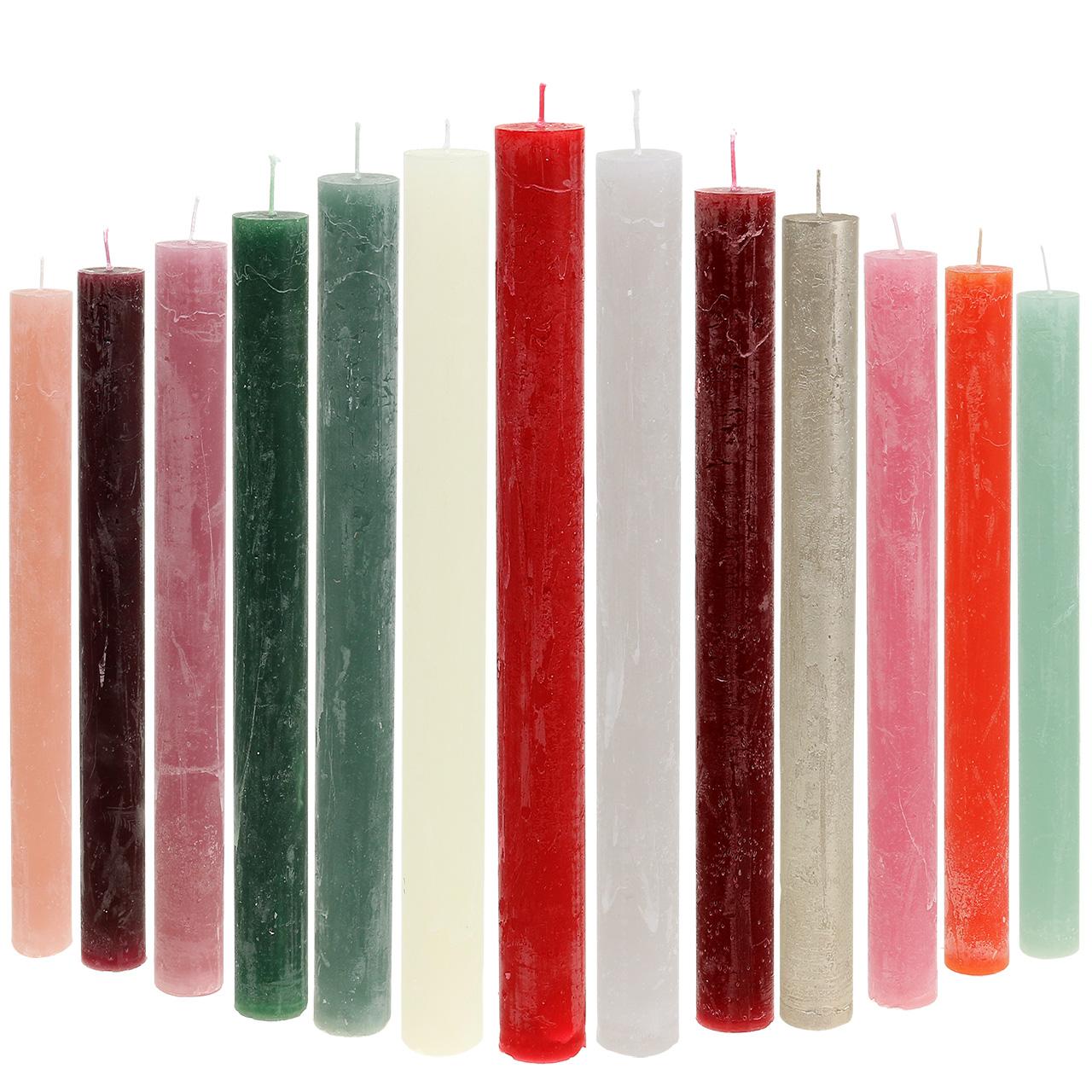 Farebné tyčinkové sviečky sú dodávané v ľahko skladovateľných kartónových škatuliach, ktoré sú zabalené v priehľadnej plastovej fólii. Každá sviečka je približne 300 mm vysoká a približne 34 mm v priemere a bude horieť približne 30 hodín.