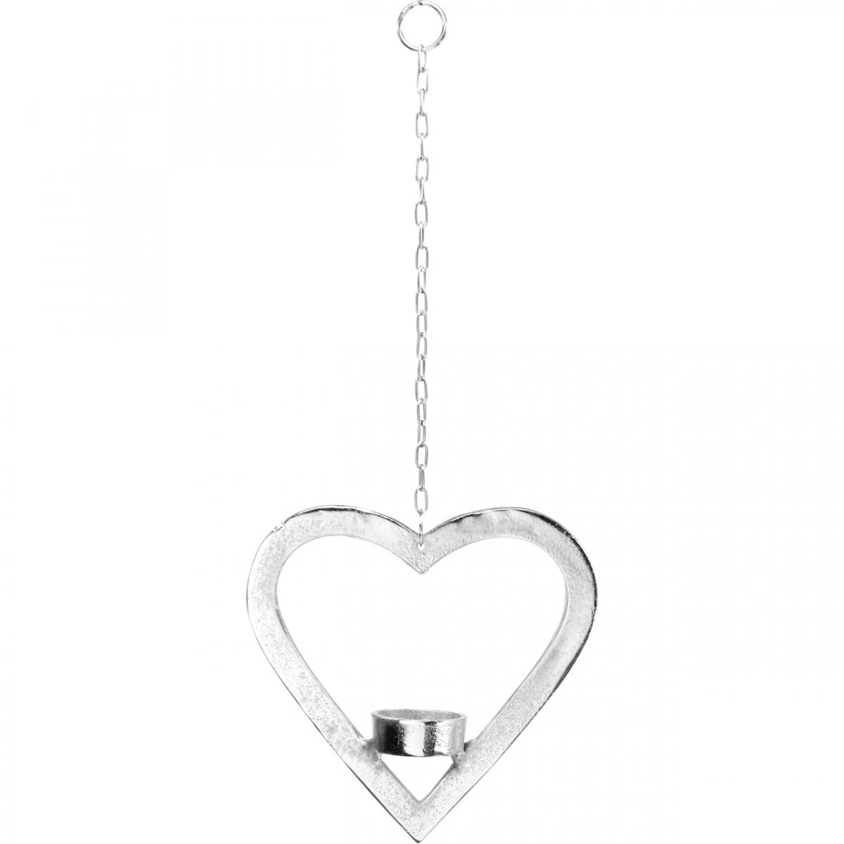Strieborné ozdobné srdce znázornené obrysom je v strede vybavené svietnikom na čajové sviečky. V hornej časti srdiečka na čajovú sviečku má kovová dekorácia kovovú retiazku na zavesenie, ktorá je ukončená uzavretým krúžkom.