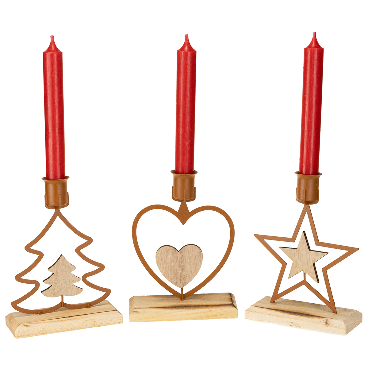 Silueta hrdzavohnedého lakovaného kovu so svietnikom na dlhé sviečky sedí na jemne flambovanom podstavci z prírodného dreva. V strede pod svietnikom je opäť vidieť hviezda, srdce a vianočný stromček ako drevené motívy.