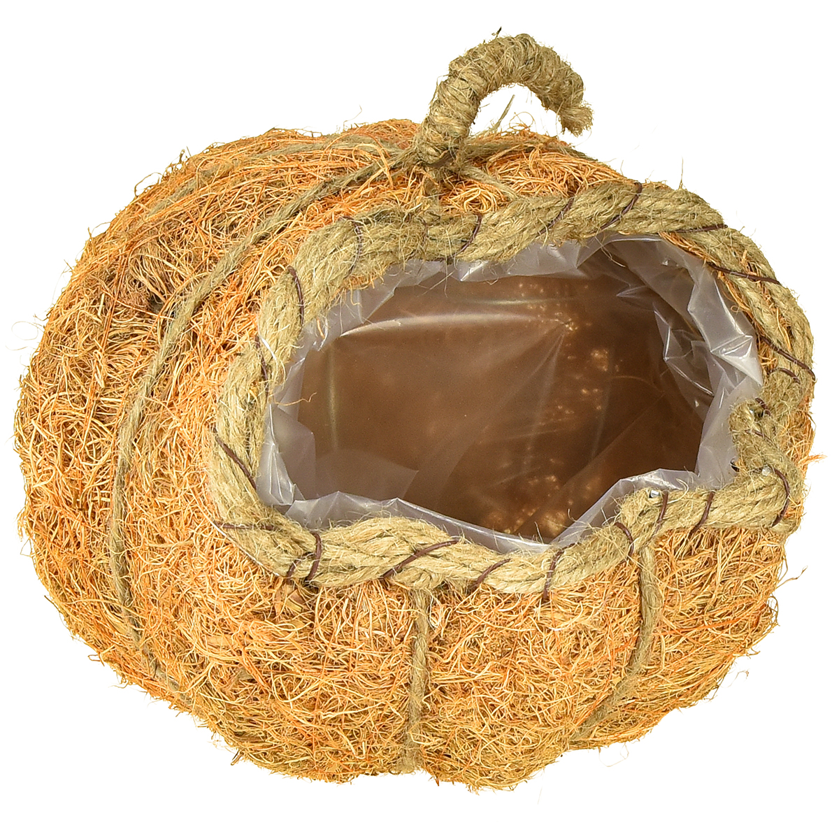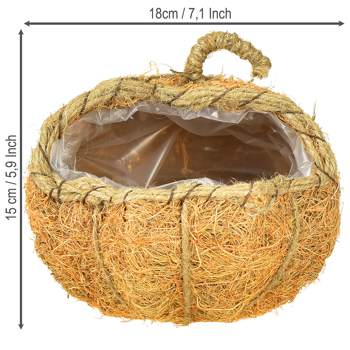 Tento kvetináč s fóliovou výstelkou je perfektným doplnkom, ktorý pozdvihne vašu jesennú výzdobu na vyššiu úroveň. Vďaka žiarivo oranžovému tamarindovému vláknu na pevnom kovovom ráme prinesie tento kvetináč do vášho domova teplo a farbu. Otvor na výsadbu je elegantne orámovaný jutou a stonka môže slúžiť nielen ako dekoratívny prvok, ale aj ako praktický háčik na premenu tekvice na pôvabný závesný košík na zavesenie rastlín. Či už na stole v obývačke ako jesenný aranžmán alebo ako príjemná dekorácia pred vchodovými dverami, tento kvetináč je všestranný. Vnútorná výstelka s fóliovou výstelkou vám umožňuje štýlovo aranžovať a vystavovať pravé alebo umelé kvety, rastliny alebo iné dekoratívne prvky.