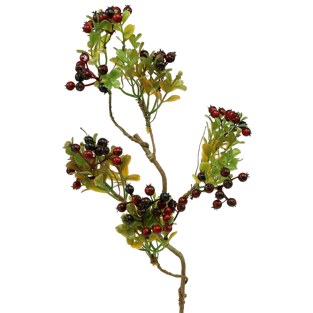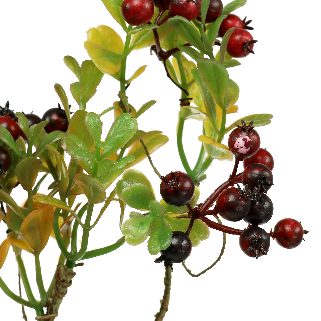 Ozdobný bobuľový ker skalníka, botanicky známy ako skalník, je spracovaný na veľmi vysokej úrovni; Bobule, listy a konáre zberu bobúľ sú navrhnuté veľmi detailne a vykazujú prirodzený rast. Mnoho malých červených a čiernych bobúľ s vyčnievajúcimi sepalmi sedí na súkvetiach v tvare dáždnika, ktoré vyčnievajú z hustej vetvy stopiek ohraničenej mnohými malými listami. Stonka dekoratívneho kríka je navyše obalená rustikálnym papierom, ktorý mu dodáva obzvlášť realistický vzhľad a je vybavená aj pružným drôteným jadrom. Vďaka tomu je umelá rastlina ideálnym kúskom do vášho jesenného kvetinárstva, či už ako súčasť kytice alebo zapichnutá do kvetinovej peny, polystyrénu či machu.