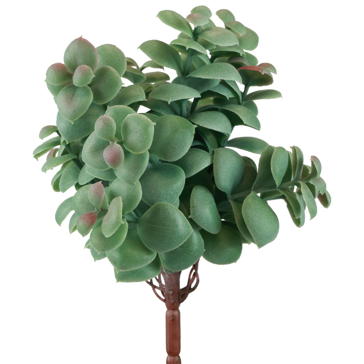 Rôzne veľké listy sú presne tvarované a sfarbené do jemne zelenej farby. Jemne ružové končeky umelých zelených rastlín dotvárajú ilúziu skutočnej sukulenty. Umelé rastliny môžu byť zapojené alebo zapojené do hnedého trsátka.