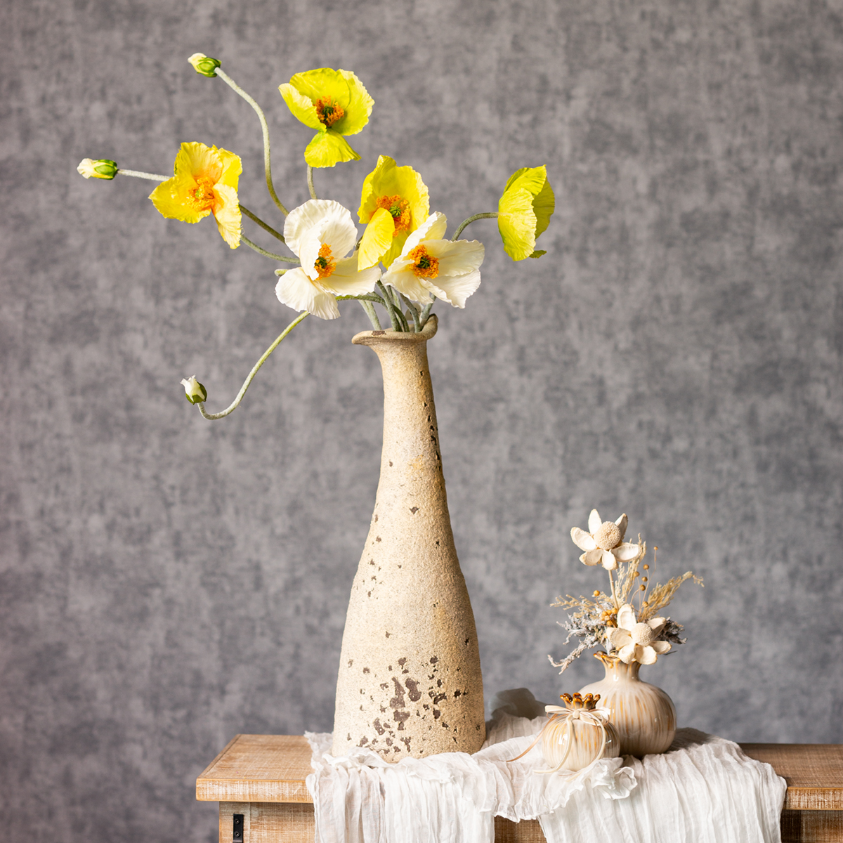 Táto 95 cm vysoká kytica umelých makov vynikne v každej miestnosti. Žiarivo žlté kvety v kombinácii s prírodnými tvarmi a elegantne zakrivenými stonkami dodávajú tomuto aranžmánu štýlový a moderný charakter. Ideálna pre fanúšikov moderného interiérového dizajnu, škandinávskeho štýlu alebo vzhľadu mestskej džungle. Táto sada troch stoniek s priemerom 30 cm a výškou 95 cm ponúka dostatok priestoru pre rôzne nápady na dekoráciu. Či už sú aranžované jednotlivo v jednoduchej váze alebo v kombinácii s inými umelými kvetmi a vytvoria tak sviežu kyticu – možnosti sú nekonečné! Maky sa obzvlášť dobre hodia k bielym alebo zeleným akcentom. Kombinácia polyesteru a plastu zaisťuje odolnosť a kvety a listy vyzerajú neuveriteľne realisticky. Ideálne pre tých, ktorí oceňujú prírodný vzhľad, ale nechcú robiť kompromisy v oblasti trvalej sviežosti. A žiadna zdĺhavá údržba? Na to môžete zabudnúť!