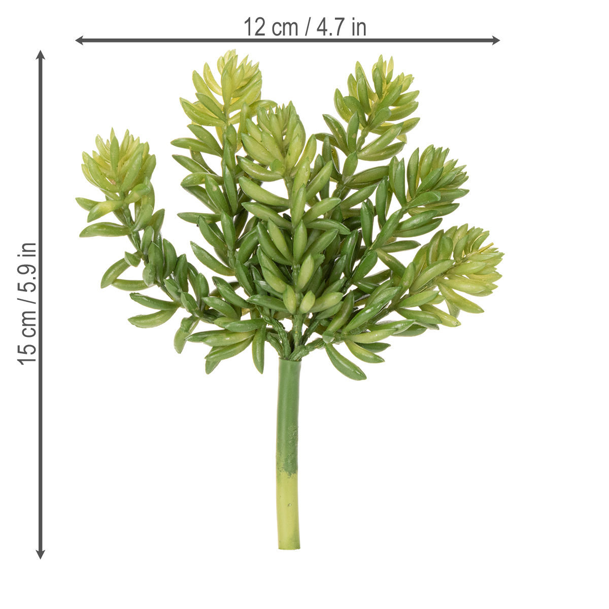 Náš umelý sukulent zaujme nielen svojím realistickým dizajnom, ale aj svojou všestrannosťou. Precízne detaily a sýta zelená farba z neho robia dokonalý dekoratívny prvok v každej miestnosti. Hrubá, pevná stonka zaisťuje, že rastlina sa hodí do každej vázy alebo aranžmánu, zatiaľ čo jej šesťramenné konáre ponúkajú obzvlášť prirodzený vzhľad. Tento umelý kvet je ideálny pre tých, ktorí hľadajú nenáročné dekoratívne možnosti. S výškou 15 cm sa perfektne hodí na police, príborníky alebo do vitrín. V kombinácii s inými dekoratívnymi prvkami, ako sú drevené misky, svietniky alebo minimalistické sklenené vázy, rýchlo vytvorí harmonický celkový vzhľad. Uprednostňujete moderný alebo škandinávsky štýl? Tento sukulent sa bez problémov začlení a zaručene upúta pozornosť! Sukulent tiež urobí skvelý dojem v kancelárii. Priestory ako recepčné priestory, čakárne alebo konferenčné miestnosti profitujú z jeho relaxačnej atmosféry a upokojujúcich zelených tónov. Chcete skrášliť svoje kancelárske prostredie bez toho, aby ste museli niekoho udržiavať? Tieto umelé rastliny ponúkajú perfektné riešenie.