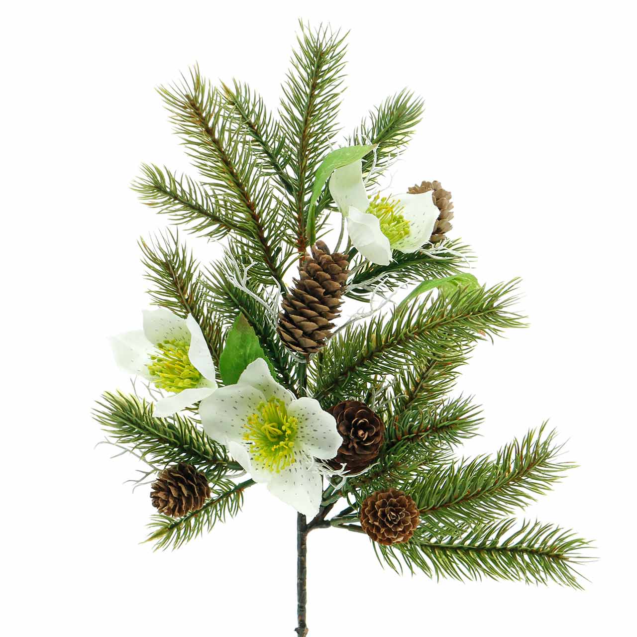 Jedľový konár ozdobený vianočnými ružami a šiškami je perfektnou dekoráciou na sviatočné obdobie!Jedľový konár s kvetmi vianočnej ruže vložte do malej vázy alebo z neho zapracujte zimný aranžmán či adventný veniec. - Pružne ohybný jedľový konár je veľmi atraktívny aj ako centrálny dekoračný predmet na kovovom ozdobnom prsteni!