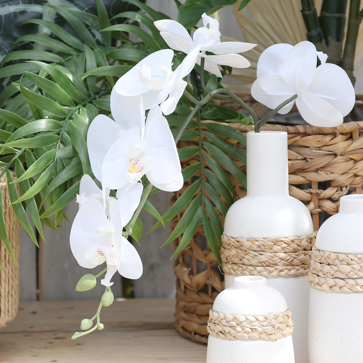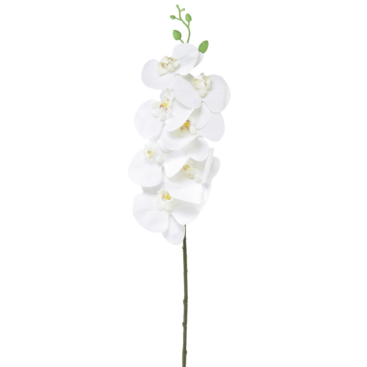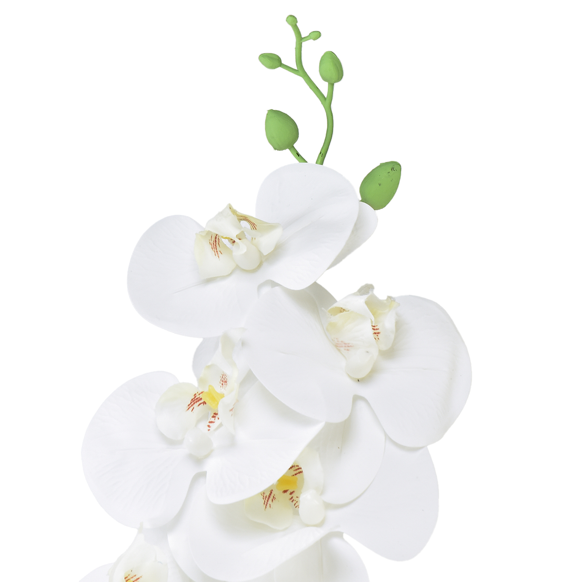 S dĺžkou niečo cez 80 centimetrov je biela orchidea ako stvorená do podlahovej vázy. Umelá Phalaenopsis predstavuje kvety a puky.