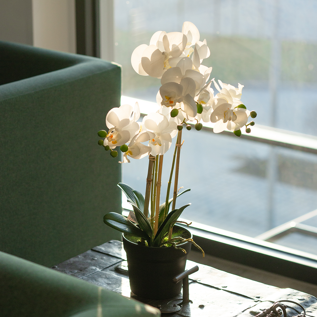 Čo robí túto orchideu takou obľúbenou voľbou? Kombinuje jednoduchú starostlivosť s vizuálnou príťažlivosťou skutočnej rastliny. Či už uprednostňujete moderný škandinávsky vzhľad, elegantný, očarujúci interiér alebo minimalistickú atmosféru, biela orchidea sa harmonicky začlení. Obzvlášť krásne vyzerá v kombinácii so zlatými alebo sklenenými vázami a doplnkami. Vytvorte si vo svojom dome alebo na pracovisku príjemnú atmosféru, ktorá vás povzbudí k zotrvaniu.