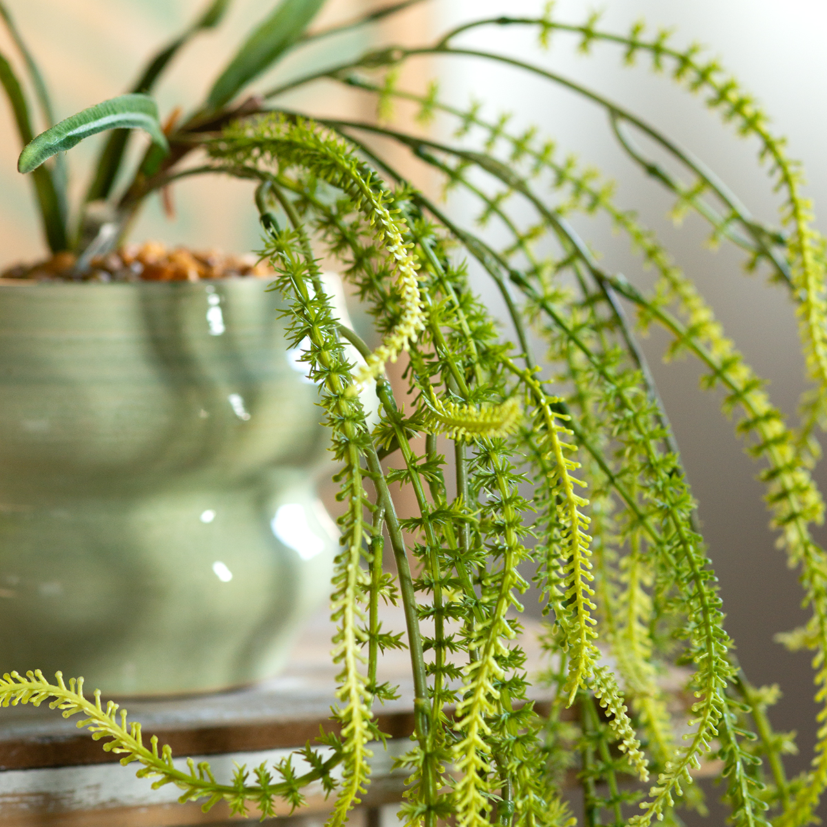 Vďaka svojmu pôvabnému tvaru a jemným štetinám je táto zelená umelá rastlina prosa líščieho chvosta skutočne všestranná. Jej dĺžka 114 cm ju robí obzvlášť atraktívnou pre všetky závesné aranžmány. Štetiny sú vyrobené z vysoko kvalitného polyesteru a plastu, vďaka čomu je rastlina nielen odolná a nenáročná na údržbu, ale tiež si zachováva svoju štruktúru a intenzitu farieb po mnoho rokov.