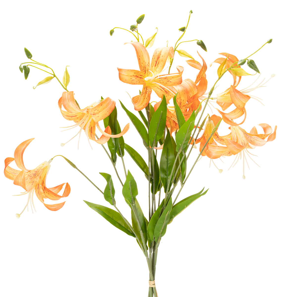 Hľadáte elegantné doplnky na vašu svadbu alebo udalosť? Naše vysoko kvalitné umelé ľalie ponúkajú dokonalú kombináciu prírodnej krásy a praktickej odolnosti. Tieto umelé ľalie zaujmú svojím realistickým vzhľadom a jemnými pomarančovými kvetmi – skutočným pútačom pozornosti! S výškou 77 cm sa tieto umelé kvety dajú bez námahy integrovať do úžasných kvetinových aranžmánov, či už ako ústredný prvok na stole, vo veľkej váze alebo ako súčasť bujnej kvetinovej aranžmánu. Či už ide o svadbu, narodeniny alebo firemnú akciu, v okamihu premenia každú miestnosť. Sú tiež fantastickou voľbou ako darček alebo dekorácia na stôl. Zaujíma vás, či vyzerajú tak skutočne? Rozhodne! Vďaka svojej kvalite a dôrazu na detail vyzerajú takmer ako čerstvo natrhané. Vyskúšajte ich a vneste do svojho každodenného života nádych elegancie!