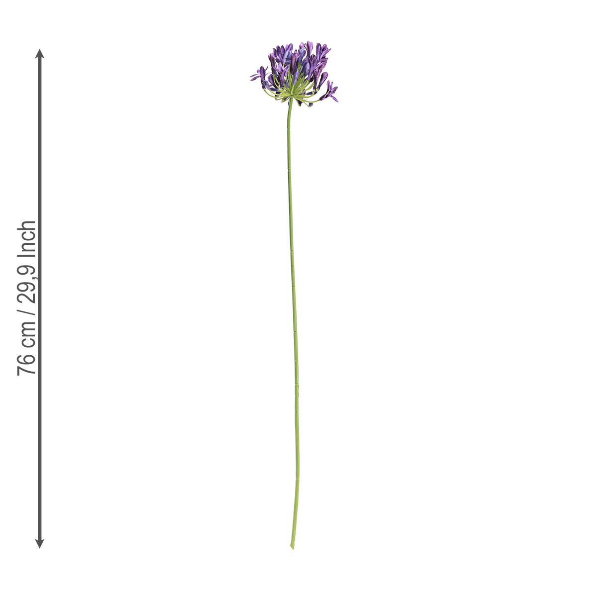 Dostanete dve dlhé stonky apagantu. Umelé agapanty majú dĺžku približne 75 centimetrov a priemer kvetov je približne 10 cm. Kovová tyč v jadre stoniek sa dá ľahko ohnúť.