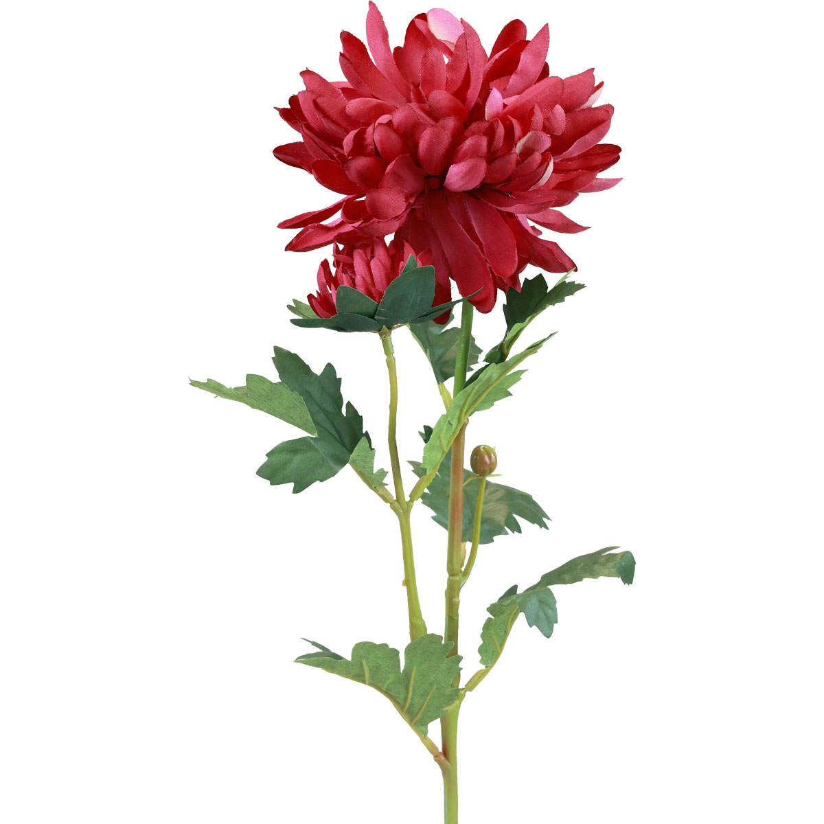 Kvalitný hodvábny kvet je dodávaný s veľmi prirodzene riešenou zelenou stonkou, ktorá sa niekoľkokrát rozvetvuje. Umelú stonku rastliny dopĺňajú početné listy typických tvarov rôznych veľkostí. Stonka umelého kvetu je vybavená pružným kovovým drôtikom, na špičke konárikov je veľký a stredný kvet georgíny v Bordeaux a tiež malý plastový púčik.
