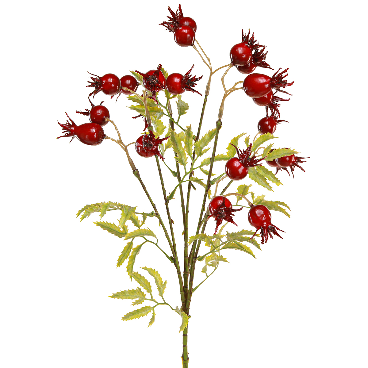 Umelé šípkové konáre s kyprými červenými plodmi na jesenné dekorácie a vianočné aranžmány
