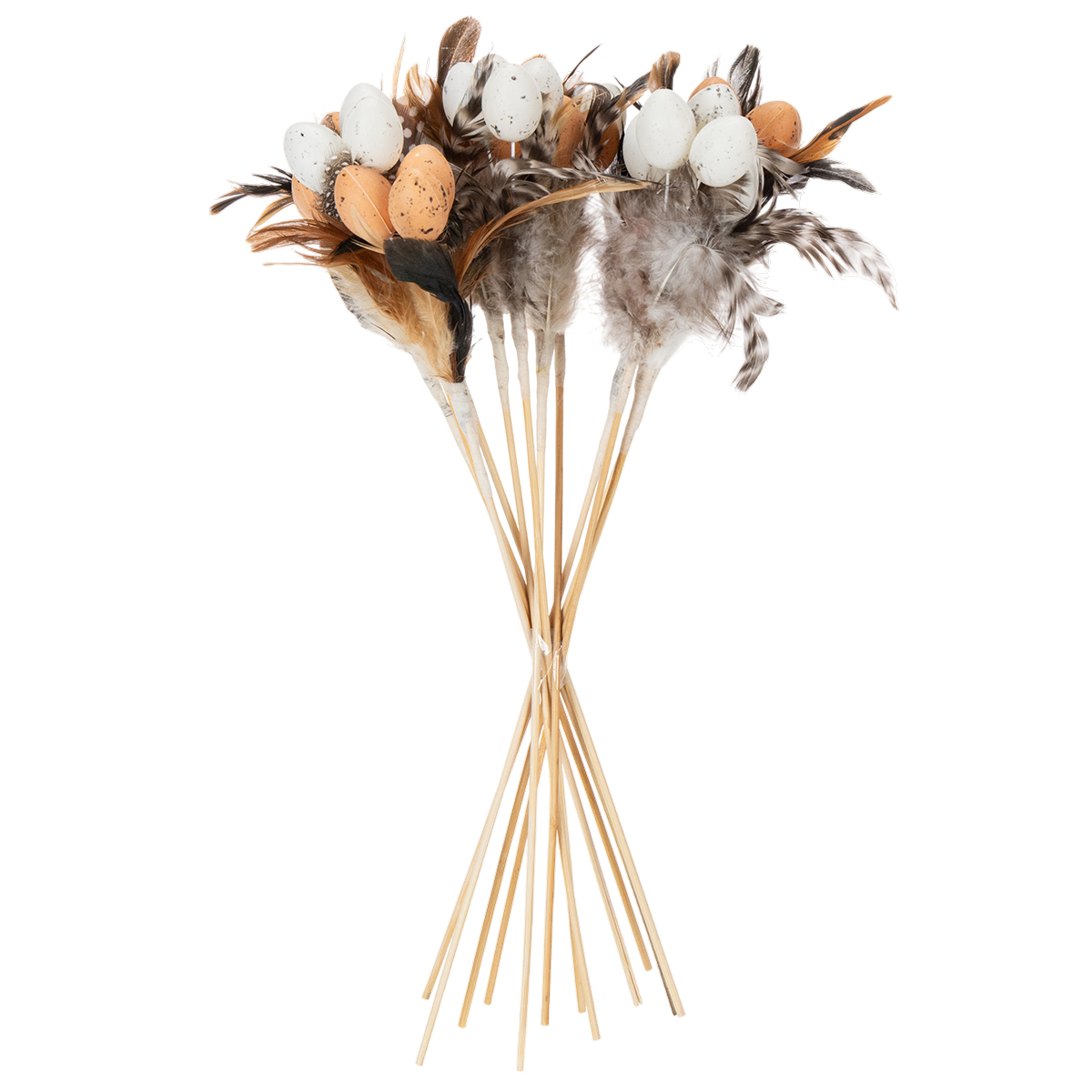 Umelé prepeličie vajcia, ozdobné pierka na paličke, 36 cm, 12 kusov