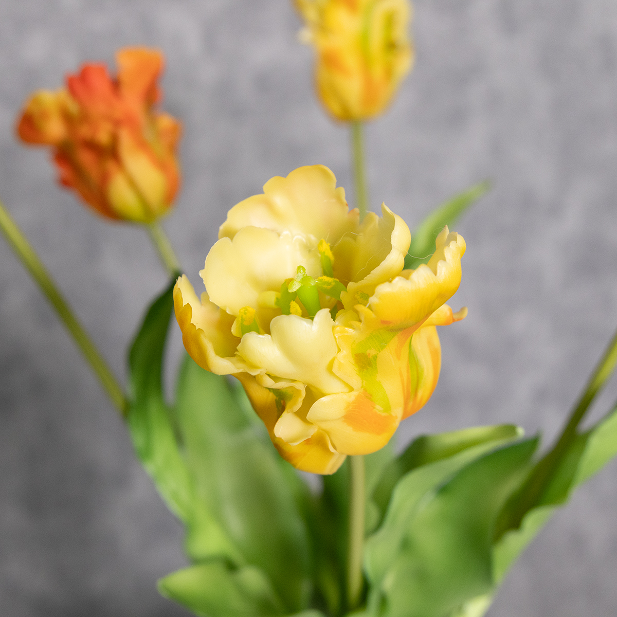 Tieto umelé tulipány sú skutočným pútačom pozornosti a zaujmú svojím autentickým vzhľadom. S výškou 53 cm a priemerom 8 cm majú ideálnu veľkosť na samostatné vystavenie v úzkej váze alebo ako štýlová kytica vo veľkej stojacej váze. Vďaka vysokokvalitnému polyesterovému a plastovému materiálu sú kvety a listy príjemne mäkké a zachovávajú si svoje žiarivé farby. Obzvlášť praktická vlastnosť: sú neuveriteľne všestranné. Či už ako elegantná dekorácia do obývačky, sezónne akcenty na jar alebo ako vrchol na oslavách – ich jasná farba skutočne zlepší náladu. Tulipány jednoducho kombinujte s inými umelými kvetmi a vytvorte harmonické kytice. Pre minimalistický vzhľad ich jednoducho aranžujte do vysokej bielej keramickej vázy. Štýl? Nadčasový a moderný! Tieto tulipány elegantne zapadajú do škandinávskeho, moderného aj klasického štýlu interiérového dizajnu. Ešte jeden tip: sú prakticky nezničiteľné – ideálne do domácností s deťmi alebo domácimi miláčikmi. Tí, ktorí často menia svoje dekorácie, si zamilujú ich flexibilitu: jednoducho vymeňte vázu, vyskúšajte nové aranžmán – a nový koncept dekorácie je vytvorený.