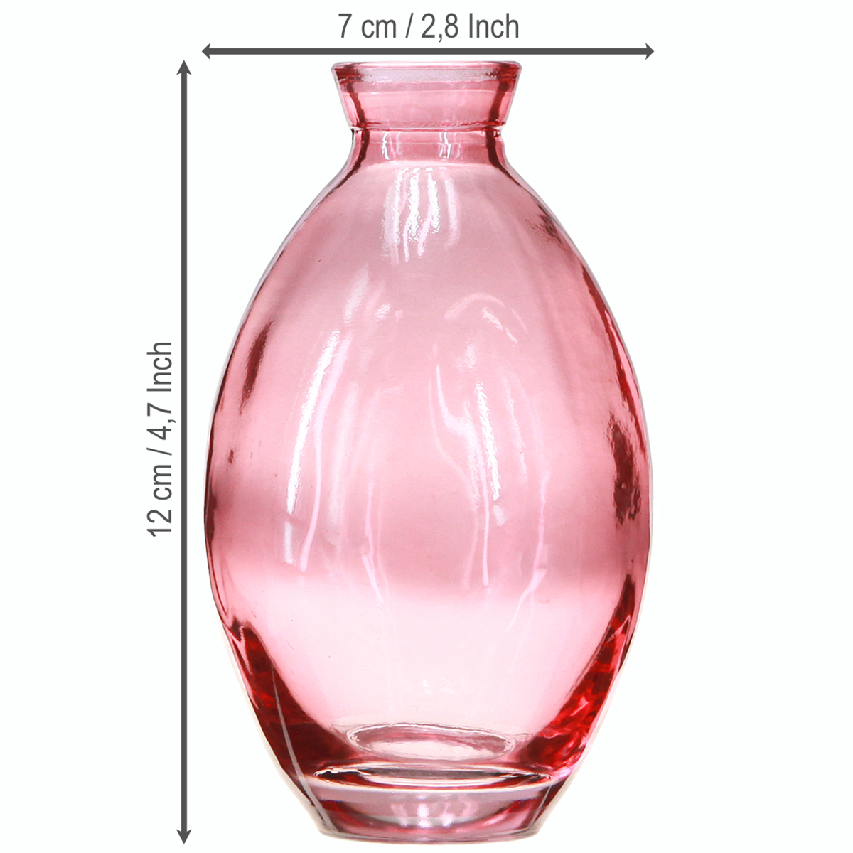 Dodajte štýlový akcent našimi cibuľovitými mini vázami z tónovaného skla v jemnej ružovej farbe. Tieto elegantné sklenené vázy sa vyznačujú úzkym, krátkym hrdlom a úzkou základňou, čo im dodáva nadčasovú krásu, ktorá je ideálna na jar, ale aj na akékoľvek iné ročné obdobie. Či už sú retro alebo vintage, tieto malé vázy sú skutočným vrcholom každého jedálenského stola. Ružový odtieň skla prináša do vášho domova jemné farebné nuansy a rozžiari každý kvetinový aranžmán. Tieto vázy sú ideálne pre kreatívne nápady na dekoráciu a pozývajú vás, aby ste preskúmali svoju kreatívnu stránku a neustále skúšali nové kombinácie. Pohodlná výška približne 12 cm a priemer približne 7 cm umožňujú rôzne možnosti dekorácie. Kombinujte svoje nové vázy s inými sklenenými doplnkami alebo ich vystavte ako samostatné kusy. Mini vázy sú ideálne pre moderný aj klasický štýl interiéru.
