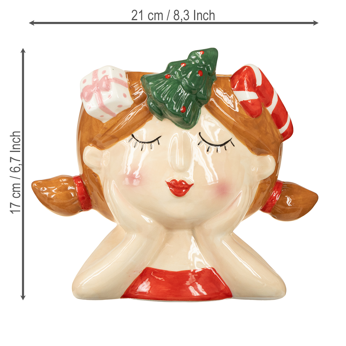 Vianoce sú za rohom a hľadáte niečo, vďaka čomu bude vaša sviatočná výzdoba skutočne jedinečná? Potom vám tento očarujúci keramický kvetináč okamžite vyčaria úsmev na tvári! Vďaka svojmu očarujúcemu dizajnu v tvare zasneného dievčaťa s vianočnými ozdobami vo vlasoch tento kvetináč nielenže prináša do vášho domova veselú vianočnú atmosféru, ale aj krásne vynikne v každej rastline alebo vašich adventných dekoráciách. Obzvlášť výrazné sú milé detaily busty, ako sú červené stužky, jej zasnený pohľad a malé vianočné prvky, ako je mini vianočný stromček a cukrová palica vo vlasoch. Vďaka tomu je tento kvetináč ideálny pre každého, kto chce do svojich dekorácií vniesť nádych humoru!