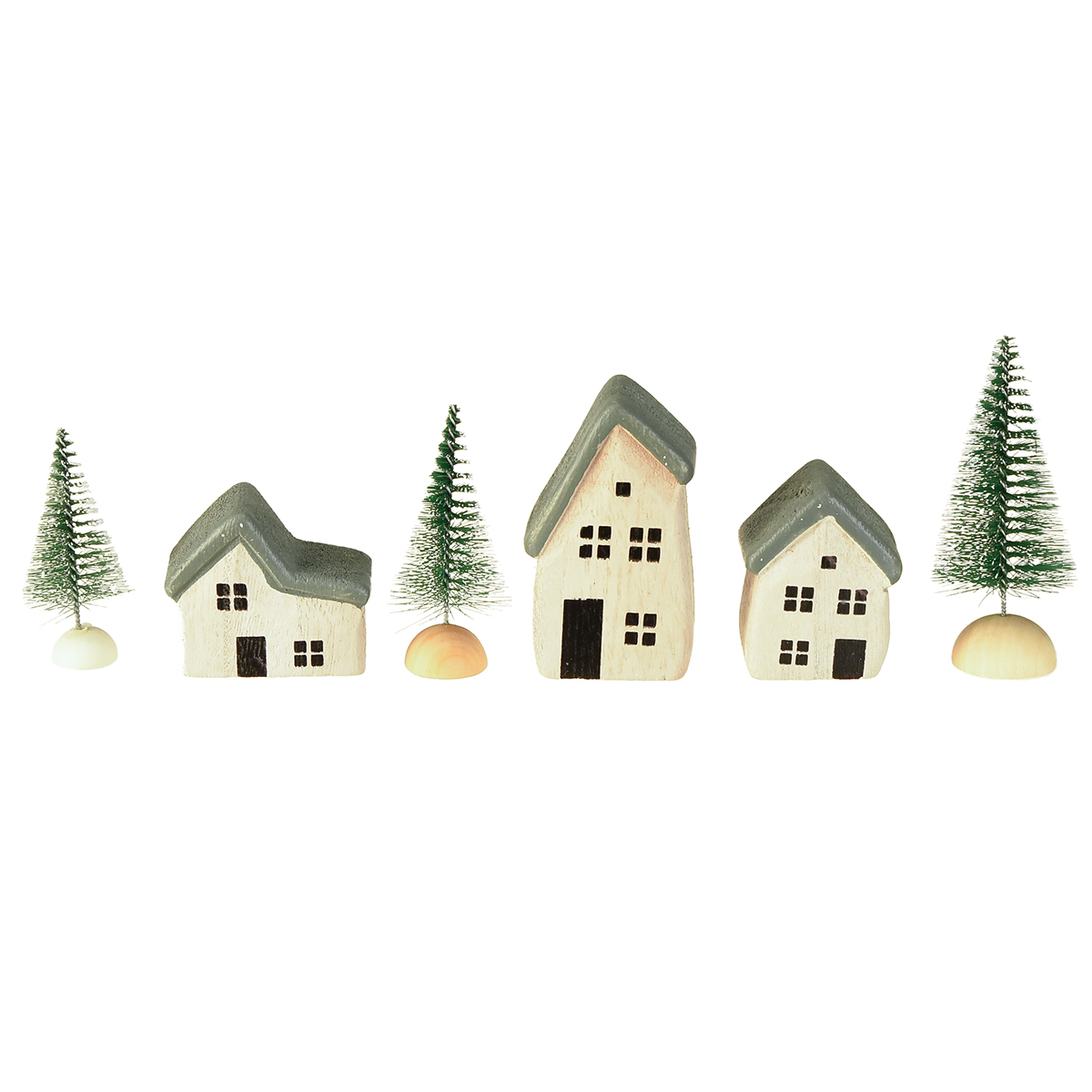 Vianočné drevené domčeky, jedličky, zelené a biele, 5-8 cm, sada 6 kusov
