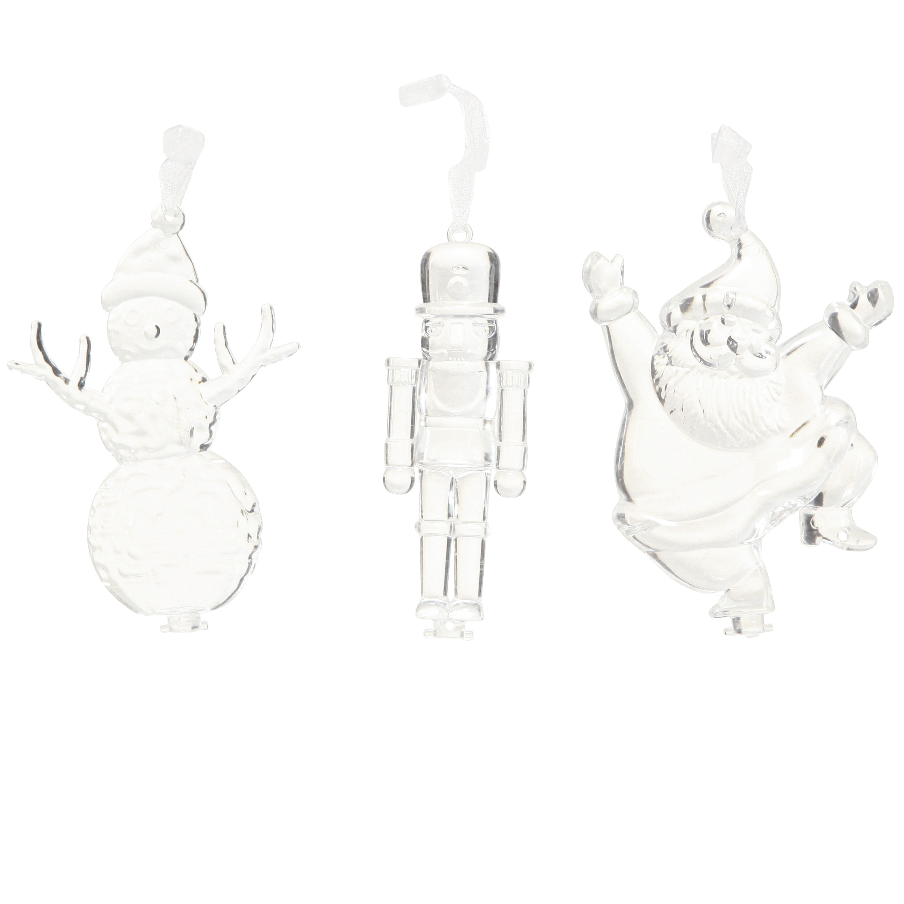 Tri priehľadné vianočné figúrky sa prezentujú ako veselý Santa Claus, usmievavý snehuliak a klasický luskáčik. Každá figúrka meria približne 9 alebo 10 cm na výšku a na jednej strane má milujúcu tvár. Ozdoby poskytujú živé akcenty týmto trojrozmerne vytvoreným postavám.