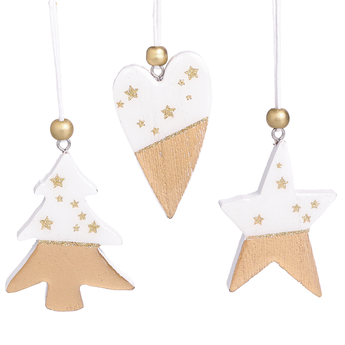 Vianočné ozdoby, drevená hviezda, stromček, srdce, 6 kusov, biele a zlaté ozdobné prívesky