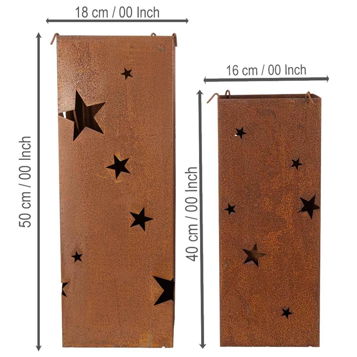 Tieto svietniky sú dostupné v sade dvoch s výškou 50 centimetrov a 40 centimetrov. Rozžiarte svoj balkón alebo terasu hviezdami v patinovanej dekorácii.