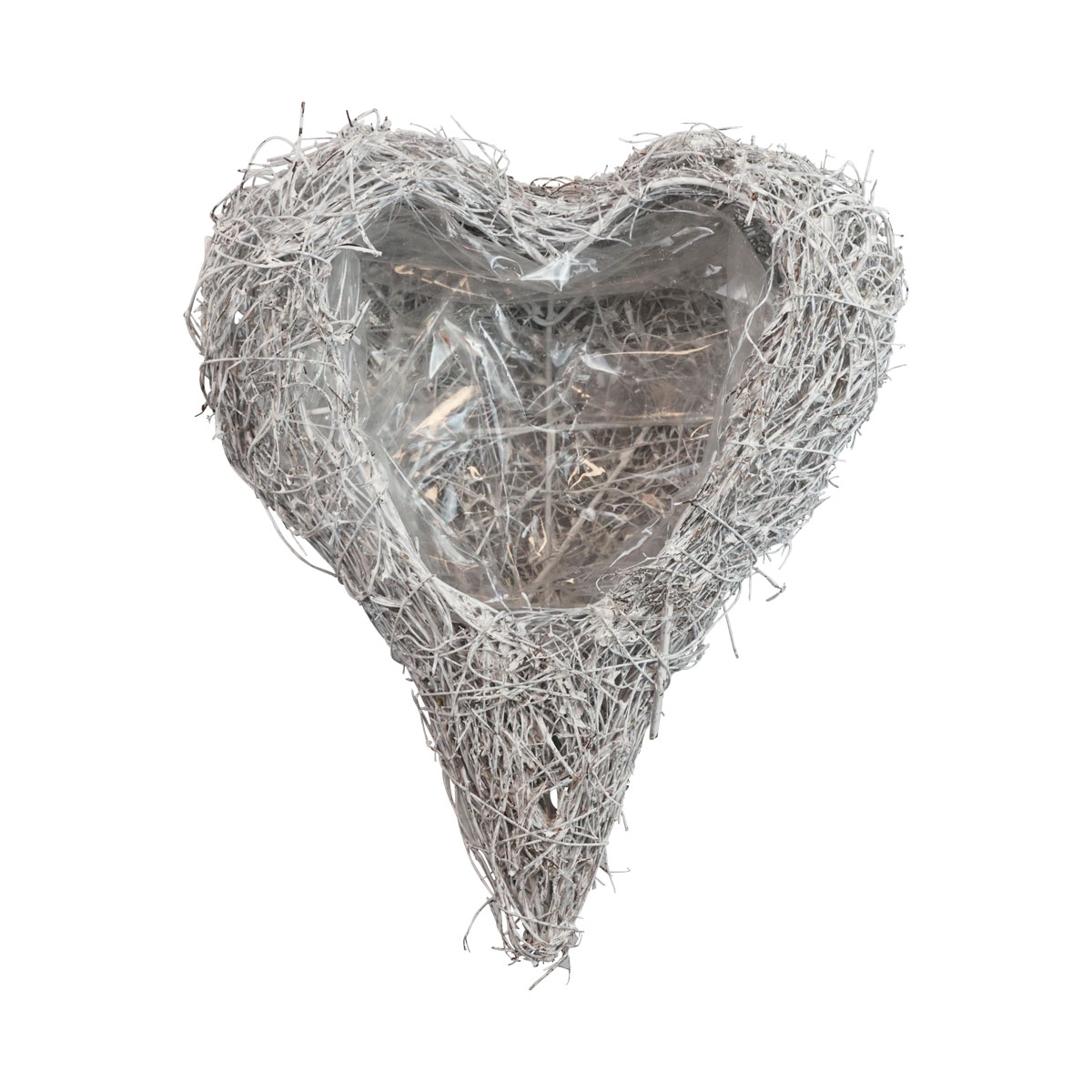 Či už smútočné šperky alebo svadobné ozdoby: toto dekoratívne srdiečko z vínnej révy vyprané v bielej farbe sa dá použiť na mnoho rôznych spôsobov. Všetko závisí od toho, ako si kvetináč vybavíte. Pre použitie ako ozdoba hrobu, napríklad v nedeľu zosnulých alebo na Dušičky, odporúčame vysadiť intenzívne žiariacu krvavú trávu alebo fialové zvončeky. Svadobné oslavy dodávajú hrejivú atmosféru výsadby levandule alebo ružového sedumu. V oboch prípadoch poskytuje biele sfarbenie a zakrivená špička kvetináča veľmi pekný kontrast. Ozdobné srdce z produktovej rady VIANA zaujme najmä spracovaním filigránových konárov viniča, ktoré sú opletené okolo kovového drôteného rámu v tvare srdca. To zaisťuje nielen krásny vzhľad, ale aj stabilitu. S výsadbou môžete začať ihneď – priehlbina v strede je už vystlaná rastlinnou fóliou. Ako základ aranžmánu sa dá samozrejme použiť aj rastlinné srdiečko.Vybielené viničové srdce má rozmery asi 30 x 25 x 7 centimetrov. Vnútorné rozmery výsadbovej plochy sú približne 13 x 13 x 5 centimetrov.