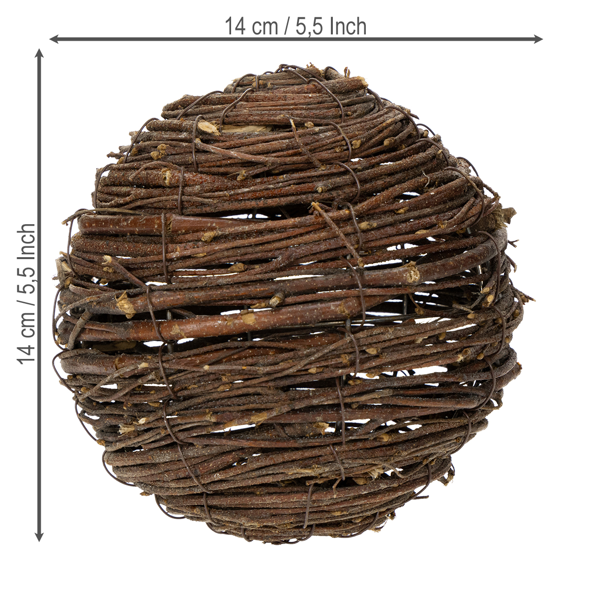 Zapletaná ozdobná guľa je ručne vyrobená z prírodného viniča. Teplá hnedá farba a rustikálna textúra konárov vytvárajú útulnú atmosféru. Vďaka robustnej kovovej mriežke znesie guľa aj väčšiu záťaž a ponúka ideálny povrch pre ďalšie dekoračné prvky ako sú sušené kvety alebo ozdobné stuhy. Ich kompaktná veľkosť z nich robí ideálny dekoratívny predmet, ktorý sa hodí do veľkých aj malých miestností.
