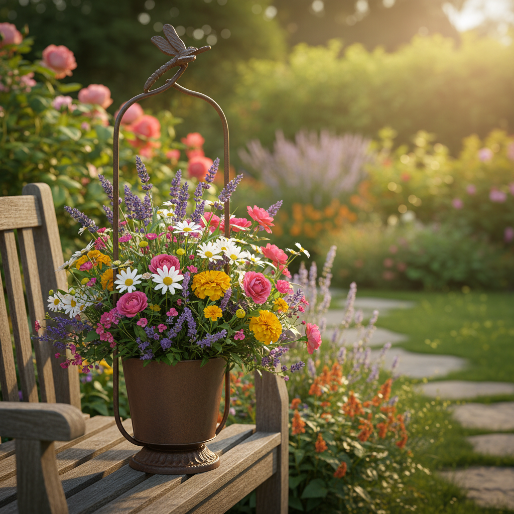 Vintage kvetináč s mriežkou a vážkou spája dizajn s funkčnosťou a dodáva vašej záhrade nostalgický šarm. Charakteristický kvetináč vyrobený z robustného kovu zaujme výrazným hrdzavým vzhľadom, ktorý do záhrady a na balkón vnáša vintage atmosféru. Kvetináč má vnútorný priemer tesne pod 16 cm a výšku približne 62 cm, čo umožňuje štýlovú prezentáciu malých rastlín aj kvitnúcich viniča. Mriežka nielenže poskytuje oporu pre vaše rastliny, ale dodáva aj dekoratívny nádych, ktorý vylepšuje vašu kvetinovú výzdobu. Vážka je tiež celá z kovu, je detailne spracovaná a dodáva vedru exkluzívny vzhľad. Vďaka svojej nadčasovej estetike sa tento kvetináč bez problémov hodí do rôznych záhradných dekorácií, či už v štýle vidieckeho domu, shabby chic alebo čarovných záhrad. Tip: Pred výsadbou vyložte vnútro fóliou, aby ste minimalizovali únik vlhkosti.