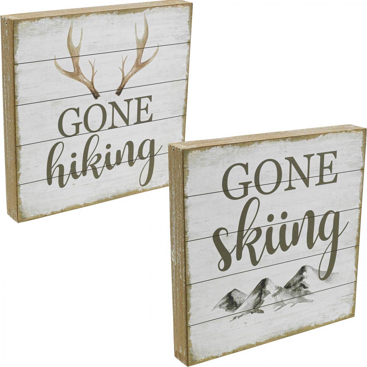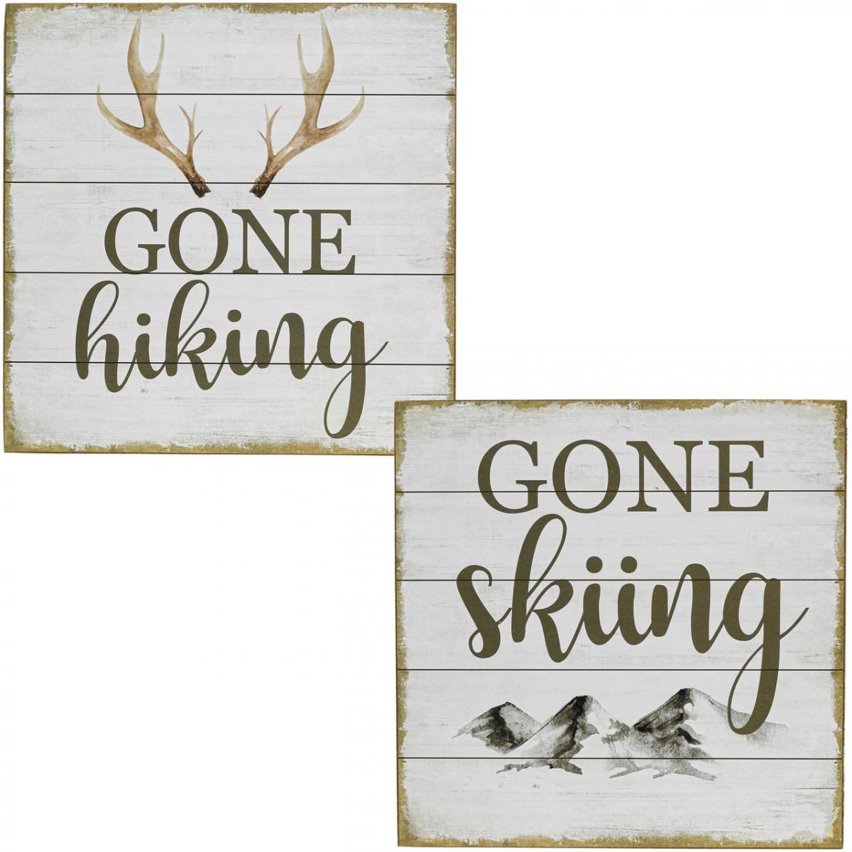 Táto sada pozostáva z dvoch tabúľ vyrobených z drevotriesky s rôznymi motívmi a nápismi. Dekoratívna tabuľa hovorí „Gone Skiing“ a tri zasnežené vrcholky hôr. Na druhom nápise je nápis „Goone Hiking“ a nad textom sa vznášajú jelenie parohy. Pozadie tvorí biela farba natretá v ošúchanom chic vzhľade, pričom stále vidíte drevo ako pozadie a jeho kresbu na okrajoch.