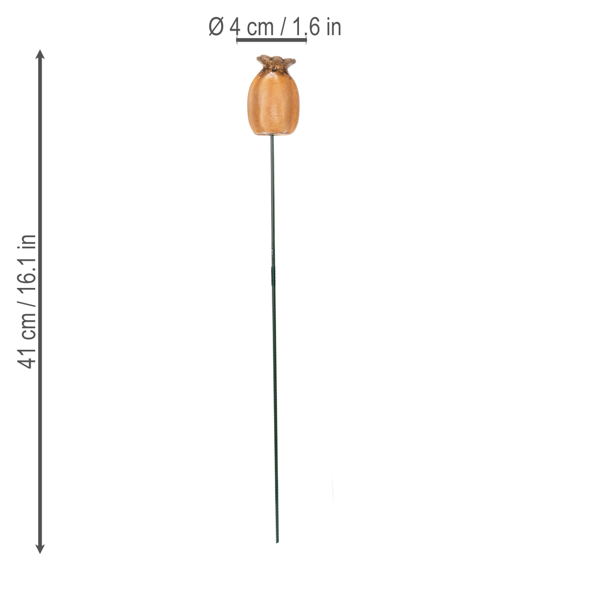 Táto sada pozostáva zo štyroch záhradných kolíkov v tvare makových strukov, vyrobených z odolnej keramiky a s dlhou kovovou tyčou. Kolíky s dĺžkou aj výškou 41 cm ponúkajú ideálnu viditeľnosť bez toho, aby pôsobili rušivo. Ručne vyrobená textúra a jemne zladený hnedý odtieň dodávajú týmto záhradným doplnkom nadčasový a prirodzený nádych. Či už uprednostňujete moderný alebo rustikálny štýl, tieto makové struky dokonale doplnia akýkoľvek záhradný dizajn.