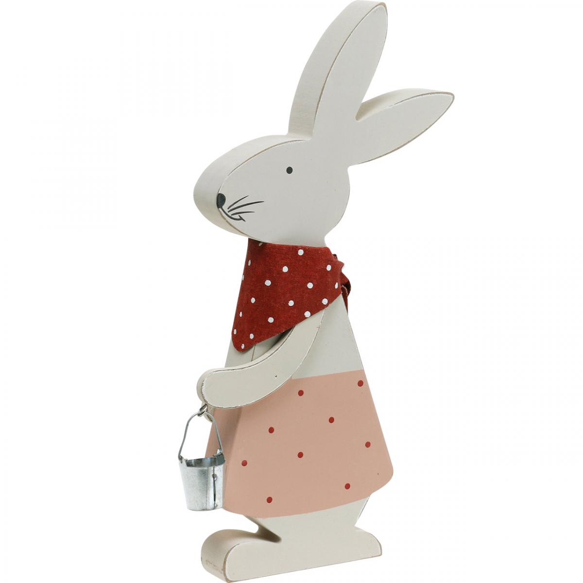 Králik vyrobený z dreva v bielej farbe s vedierkom má výšku asi 28 centimetrov a šírku asi 13 centimetrov. Hrúbka drevenej veľkonočnej dekorácie je cca 3 centimetre.