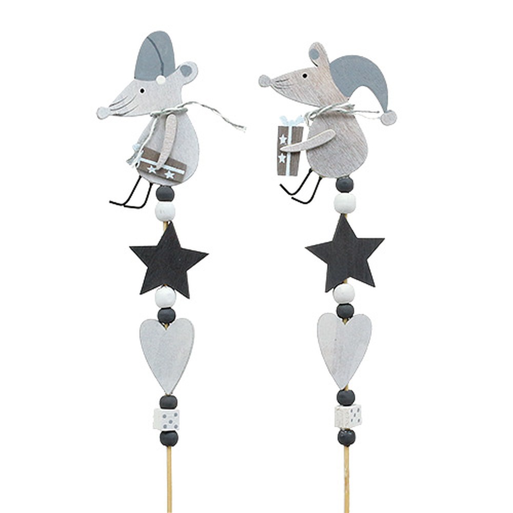 Roztomilé myši so špičatými klobúkmi - odkiaľ to máte? Vo Floristik24, samozrejme! Táto dekoratívna drevená palica má na špičke sivú myšku, na hlave mikulášsku čiapku, ktorá šťastne nesie darčekový balíček a nenútene drží balíček pod jednou pažou a prechádza sa. Oba varianty navyše nosia bielo-sivú niť ako šatku a majú malé nožičky z čierneho kovu. Pod vianočnými figúrkami je niekoľko drevených korálok v šedej a bielej farbe, ako aj srdiečko, vianočná hviezda a hracia kocka.Spodná časť palice je úplne bez dekorácií, takže celú ľahko zapichnete do pôdy vašich črepníkových kvetov. V adventnom období si môžete svoje rastliny ozdobiť vianočnými ozdobami aj sami. Drevené zátky môžete zakomponovať aj do kytice a do mašle darčekového balenia.