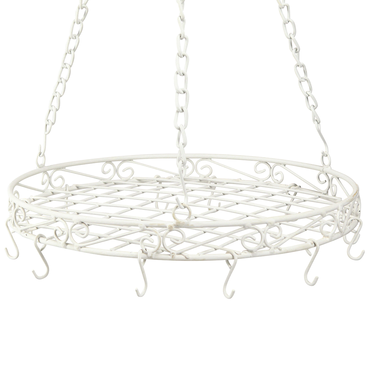 Kovová závesná dekorácia ako podnos v bielej farbe je príkladom elegantnej kovovej dekorácie, ktorá slúži ako praktický aj estetický pútač. S priemerom okolo 29,5 cm a výškou okolo 55 cm zaujme šikovným dizajnom. Plochý sieťovaný košík, ktorého okraj zaujme štýlovými výrezmi, ponúka oporu pre retiazky s tromi očkami. V spodnej časti je celkom dvanásť háčikov, ideálnych na ozdobné stuhy, retiazky alebo aj na aranžovanie úponkov visiacich rastlín. Oká v mriežke sú od seba vzdialené približne 3 cm, ideálne na aranžovanie a vystavenie vašich obľúbených dekorácií.