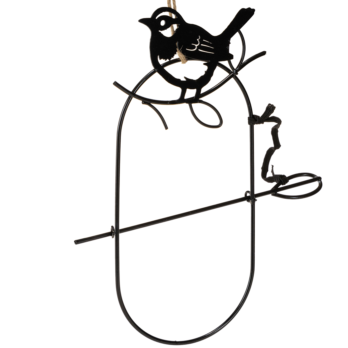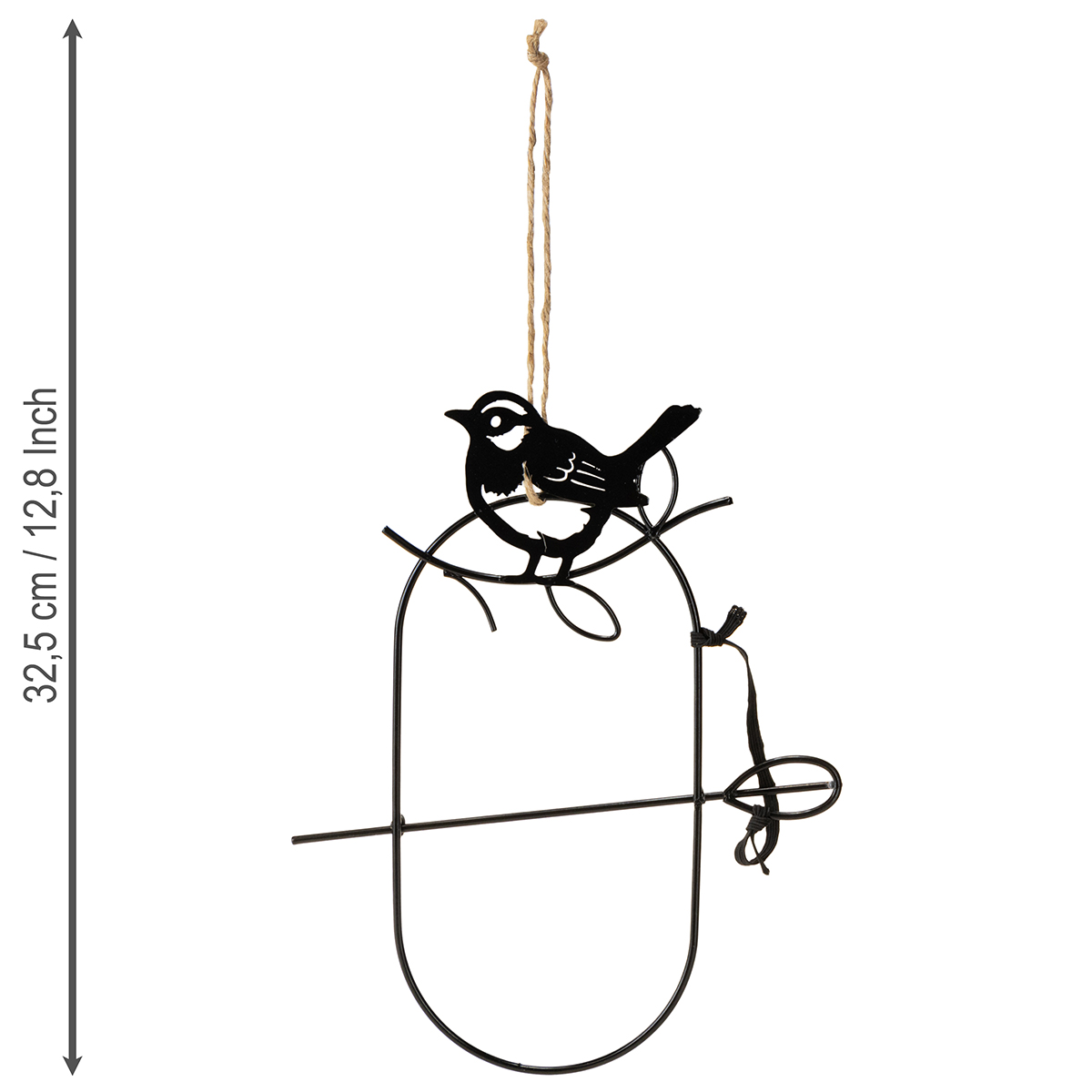 Ozdobné vtáčiky sedia na oválnom prstenci, ktorý je predelený čiernou kovovou tyčou. Tyč v tejto závesnej dekorácii je pripevnená na gumičku. Dá sa ľahko odstrániť a zavesiť naň jednotlivé dekoratívne prvky, ako je tráva alebo malé drevené vešiaky.