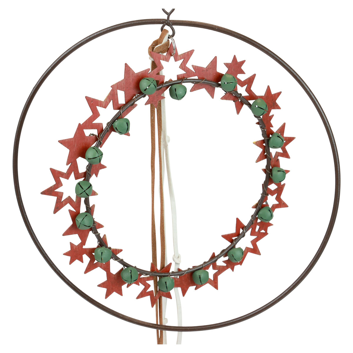 Dva kovové krúžky tvoria túto elegantnú vianočnú závesnú dekoráciu. Ak má vonkajší krúžok jednoduchý kovový povrch, vnútorný krúžok je obzvlášť atraktívny. Okolo prsteňa sú v intervaloch drôtované malé zelené krížové zvončeky a kruh hviezd, vďaka čomu kovová dekorácia pôsobí obzvlášť vintage.