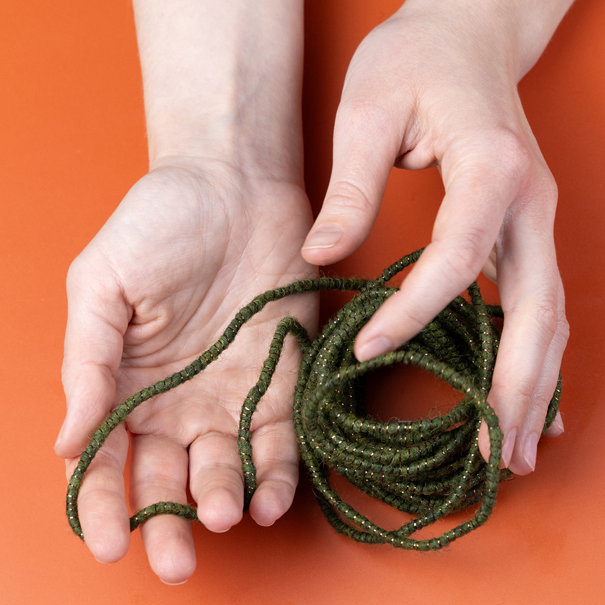 Sýty zelený odtieň v kombinácii s jemnými zlatými niťami dodáva nádych sofistikovanosti a krásne dopĺňa prírodný, rustikálny alebo dokonca glamour štýl. Pre každého, kto rád prispôsobuje svoj dekor štýlom, je táto šnúra skutočnou inšpiráciou. Nechajte sa inšpirovať a objavte nové spôsoby, ako vylepšiť svoje projekty – od bytových doplnkov až po sezónne ozdoby.