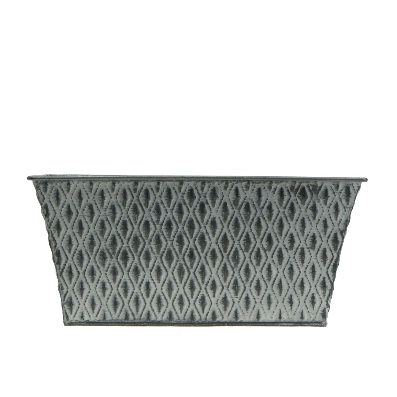 Obdĺžnikový zinkový hrniec s diamantovým vzorom má rozmery približne 26 x 15,5 cm. Výška je asi 12 centimetrov.
