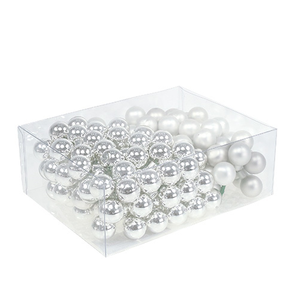 Dodávaná krabička obsahuje celkom 140 zrkadlových bobúľ vyrobených z lesklého a matného skla v striebornej farbe, každá s pripevneným zeleným drôtikom. Gule na vianočný stromček majú priemer cca 25 milimetrov a s drôtikom sú dlhé cca 15 centimetrov.