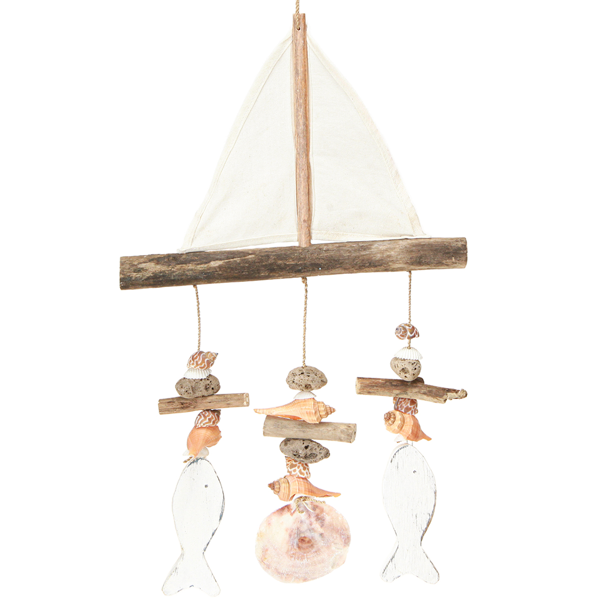 Dodajte svojmu domovu očarujúcu atmosféru plážového domu s našou zvonkohrou s dekoráciou plachetnice a rybami vyrobenými z bieleho a prírodného dreva. Táto pôsobivá námorná závesná dekorácia je ideálna pre všetkých, ktorí chcú vo svojich obytných priestoroch cítiť čaro mora. Plachetnica zaujme jemným spracovaním a použitím prírodných materiálov ako je drevo a mušle, ktoré vytvárajú relaxačné a harmonické prostredie. Závesná dekorácia s námornou tematikou je ideálna ako zvýraznenie v obývačke alebo na balkóne na upútanie pozornosti. Prírodné farby dreva a bielená textilná plachta tiež vnesú do vašej dekorácie príťažlivý pokoj. Plachetnica dokonale kombinovaná s ďalšími námornými doplnkami, ako sú siete a kotvy, poskytuje osviežujúci vánok v každom rohu domu.